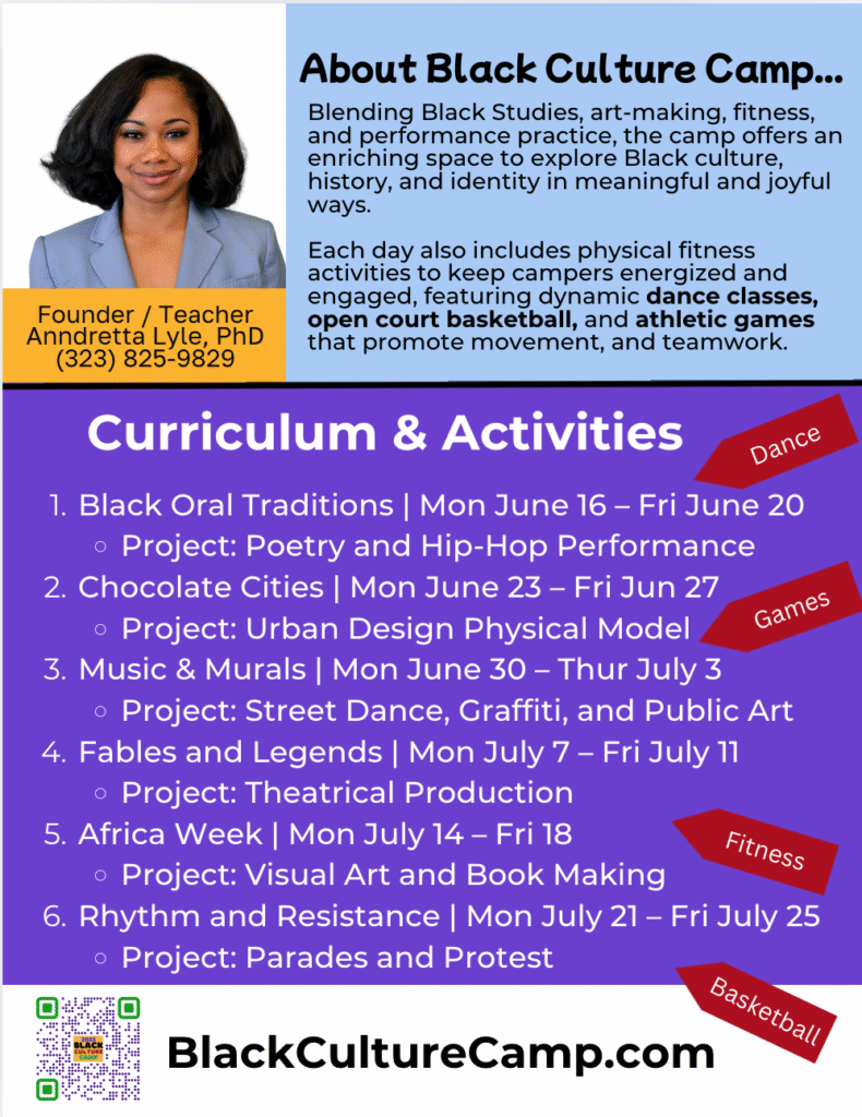Black Culture Academy is a private K–12 instruction hub grounded in Black Studies, the arts, and social justice education. We are committed to cultivating confident, creative, and critically aware scholars—ready to thrive academically and lead with purpose. Our curriculum integrates: